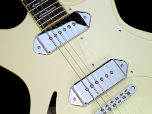 Täyttyy myöntää, että olen itse aikamoinen P-90-mikrofonien fani. Italia-kitarassa löytyy heti kaksi, Wilkinsonin valmistamaa kappaletta, joilla on kromattuja metallikansia.
